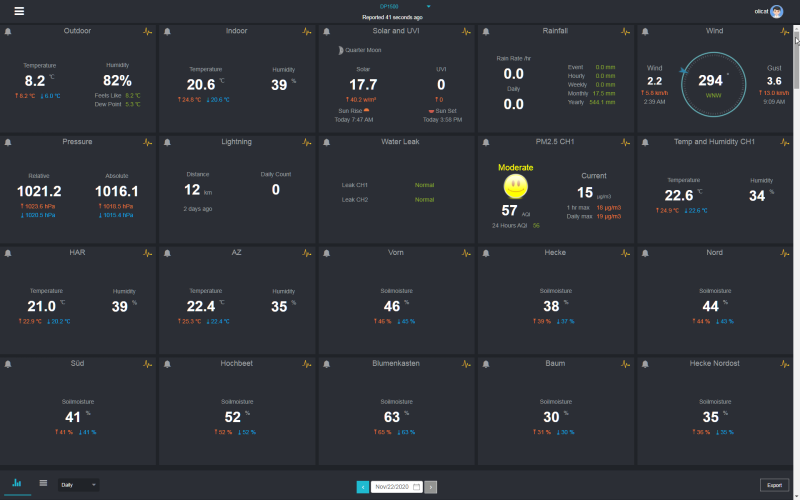 Ecowitt ist der einzige Dienst, der sämtliche am GW1000/DP1500 angebundene Sensoren verarbeiten und visualisieren kann. Kein Wunder - hier ist der Hersteller der Wetterstationen (Ecowitt) auch gleichzeitig der Hoster. Somit kann ein eigenes Datenformat (Ecowitt) zur Übertragung der Messwerte definiert und auch gleich in den eigenen Wetterstationen implementiert werden.