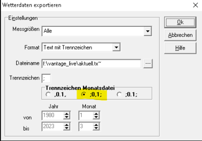Damit das Diagramm richtig erstellt wird, muss in WSWIN folgendes unter „Datei → Exportieren… → Wetterdaten exportieren“ eingestellt werden. Sonst ist das Ergebniss nur Moderne Kunst.