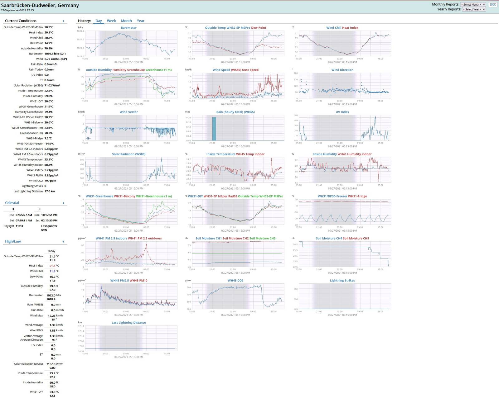 Nachstehend ein Beispiel der Seasons-Skin (erstellt mit weewx 4.5.3) - Grundlage: eine Ecowitt 2553 Station mit zusätzlichen Extra-Sensoren, die Sensor-Daten empfangen und verarbeitet von einem zusätzlichen Ecowitt GW1000 und von weewx auf einem Raspberry Pi 4 mit Hilfe des GW1000 API Treibers abgefragt und verarbeitet. (Hierfür gibt es eine erweiterte Version von Gary Rodericks GW1000 0.4.1 API Treibers erstellt von Werner Krenn: https://www.pc-wetterstation.de/forum/viewtopic.php?f=26&t=10333; mittlerweile [April 2022] auch auf den WS90 erweitert. Mittlerweile gibt es auch den „offiziellen“ GW1000 API Treiber in der Version 0.6.3, der ebenfalls den WS90 Sensor via GW1x00 und GW2000 beherrscht. s.o.)