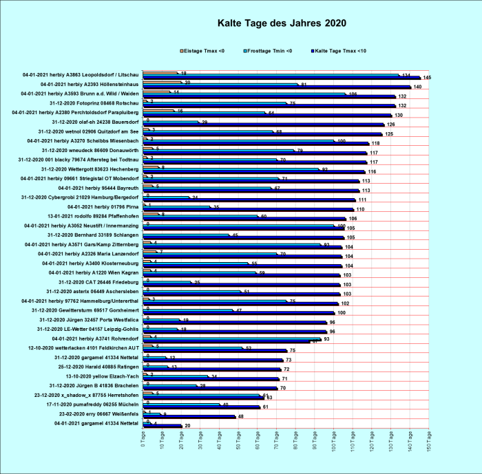 | Datum,User,PLZ,Ort | Kalte Tage Tmax<10 | Frosttage Tmin <0 | Eistage Tmax <0 |