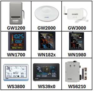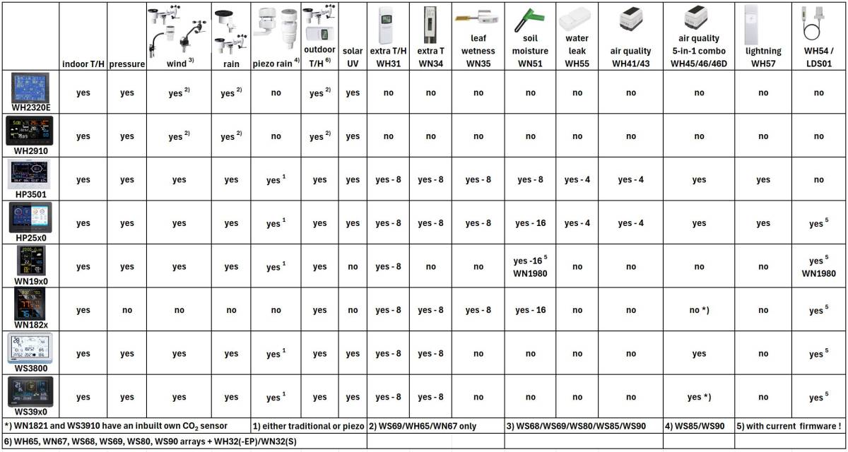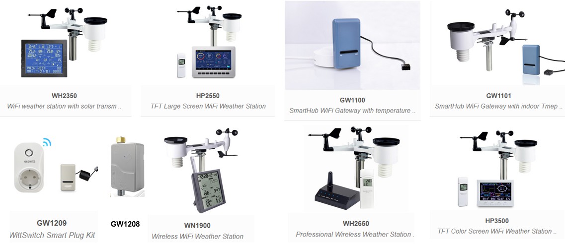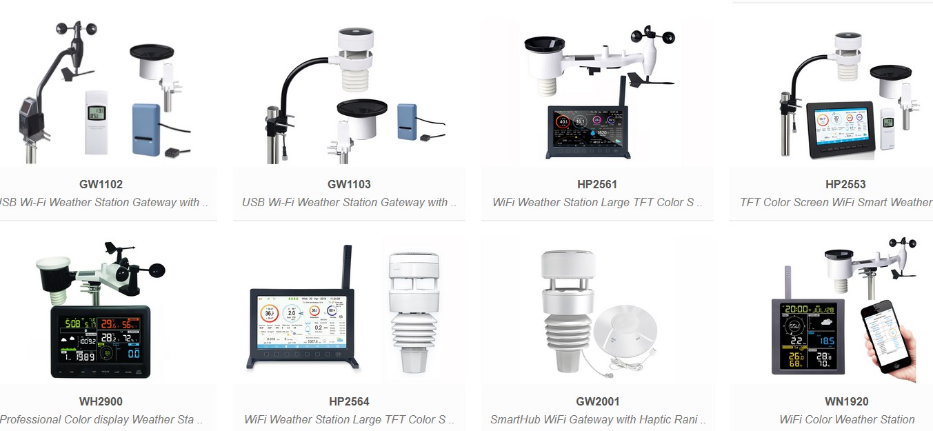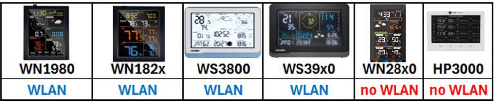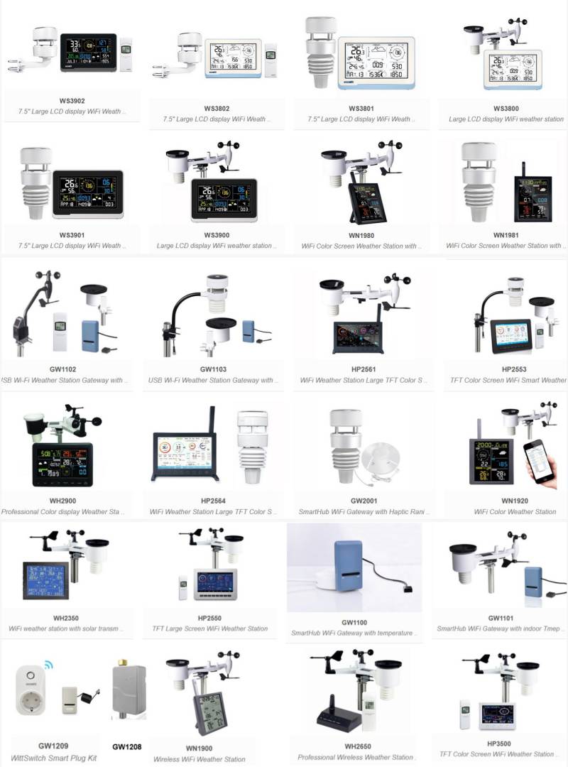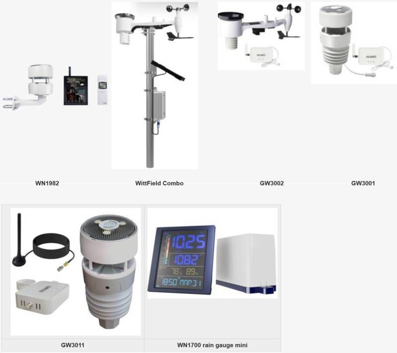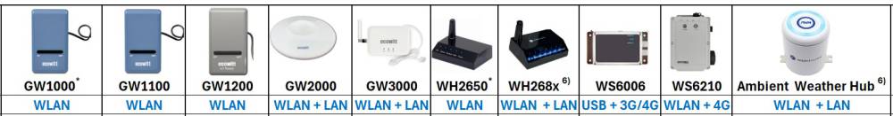 - WH2650 WiFi (Nachfolgemodell des WH2600 LAN-Gateways mit WiFi - wird unter verschiedenen Namen von verschiedenen Händlern verkauft, z.B. Froggit, Steinberg Systems, Waldbeck, … hauptsächlich in Europa - nicht IoT-fähig)