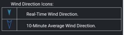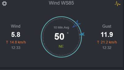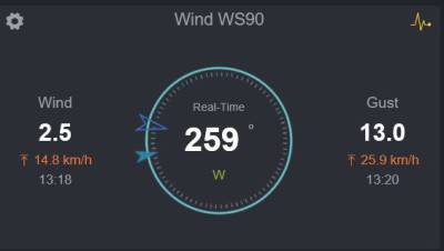 - die Windgeschwindigkeit, höchste Böengeschwindigkeit des Tages, Windrichtung (WS90)