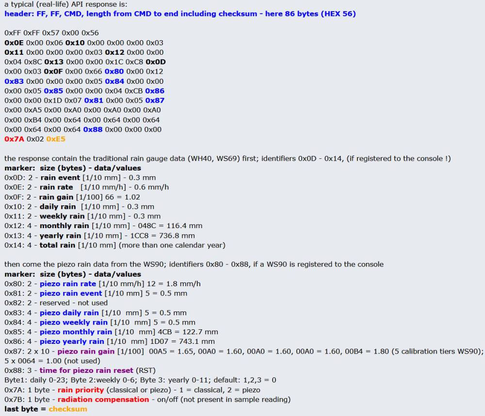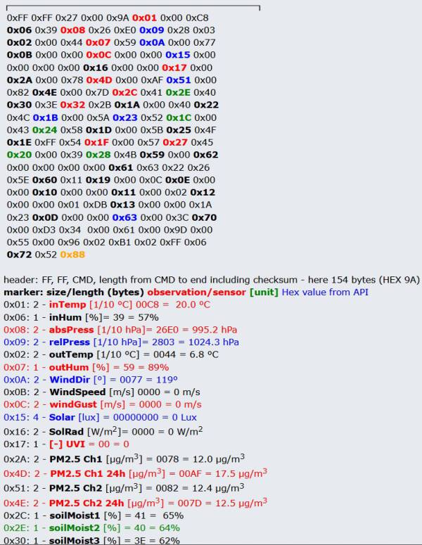 weiter unten eine reale API-Antwort von einem GW1100-Gateway - die Liste der angeschlossenen Sensoren wird unter der Antwort und der Dekodierungsbeschreibung angezeigt (ein Softwareprogramm zur Dekodierung der API-Antwort muss die Beobachtung (Markierung, Kennung) und die zugehörigen Daten nach der Markierung identifizieren.