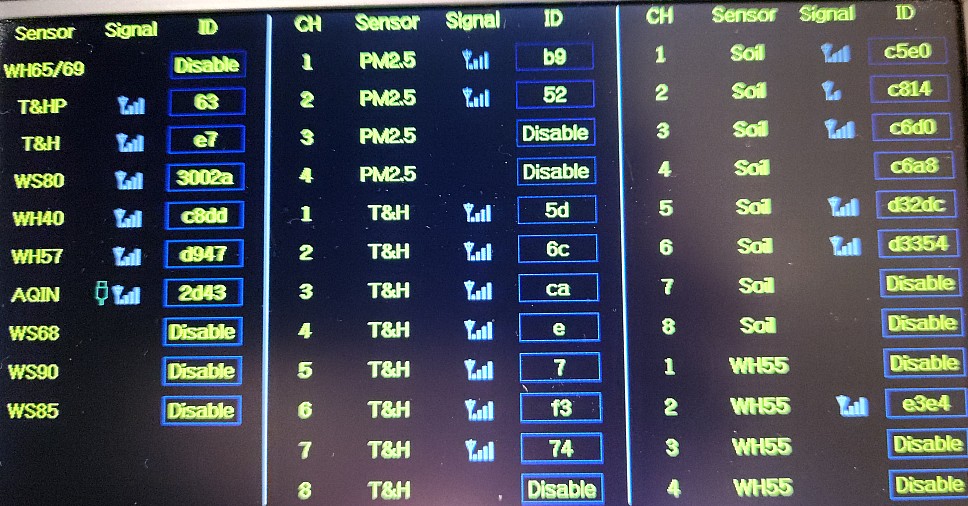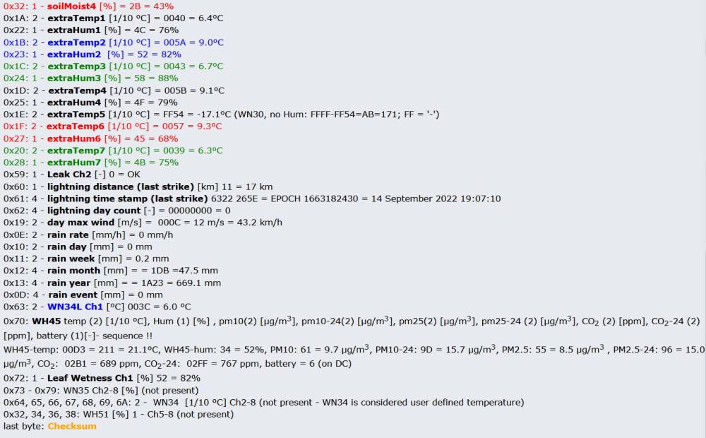 Auf den ersten Blick mag es so aussehen, als ob die Reihenfolge der Marker nicht wirklich aufsteigend und irgendwie chaotisch ist - es gibt eine gewisse eingebaute Logik -, aber um zu entschlüsseln, muss man zuerst die Innensensoren und dann die Außensensoren nehmen. Die ersten Marker 0x01, 0x06, 0x08 und 0x09 sind die Innentemperatur, die Innenluftfeuchtigkeit, der absolute Luftdruck und der relative Luftdruck. Dann folgen die Außensensoren 0x02 in aufsteigender Reihenfolge (mit ein paar Ausnahmen :-?): für eine Extra-Temperatur gibt es eine zugehörige Extra-Luftfeuchtigkeit, die nach dem 8. Extra-Temperatursensor zu zählen beginnt; auch die PM2.5 WH41-Sensoren sind etwas aus der Reihenfolge geraten - das liegt am historisch gewachsenen API). Eine Dekodierungssoftware muss diese Reihenfolge für eine korrekte Dekodierung kennen. Auch für die WH45-Werte muss die Byte-Reihenfolge, Größe und Zuordnung bekannt sein. Ein WH51-Bodenfeuchtesensor hat immer einen entsprechenden Bodentemperatursensor zum „Nachbarn/Nachfolger“) - und das API erlaubt 16 Bodenfeuchtigkeits- und 16 Bodentemperatursensoren (und 8 Benutzer-Temperatursensoren), aber die Konsolen-Firmware erlaubt (bisher) nur 8 WH51-Bodenfeuchtesensoren. Die verbleibende 8 sind ungenutzt. Die 16 Bodentemperatursensoren sind bislang komplett ungenutzt. Dann gibt es noch 8 Benutzer-temperatursensoren (WN34). Am Ende kommen die maximalen täglichen Windböen und die mit einem traditionellen Kipplöffel-Gerät gewonnenen Regendaten. Da theoretisch alle möglichen Sensoren an die Konsole angeschlossen werden könnten, müssen alle auf ihr Vorhandensein und, falls vorhanden, auf ihre Beobachtungsdaten überprüft werden. Daher ist das Schreiben von Software für diese Dekodierung eine ziemlich anspruchsvolle und komplexe Aufgabe.