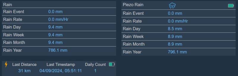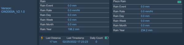 - 1 WH57 mit täglicher Blitzzählung, EPOCH-Zeitstempel (vergangene Sekunden seit 01-Jan-1970, 00:00 UTC) des letzten Blitzes und Entfernung des letzten Blitzes